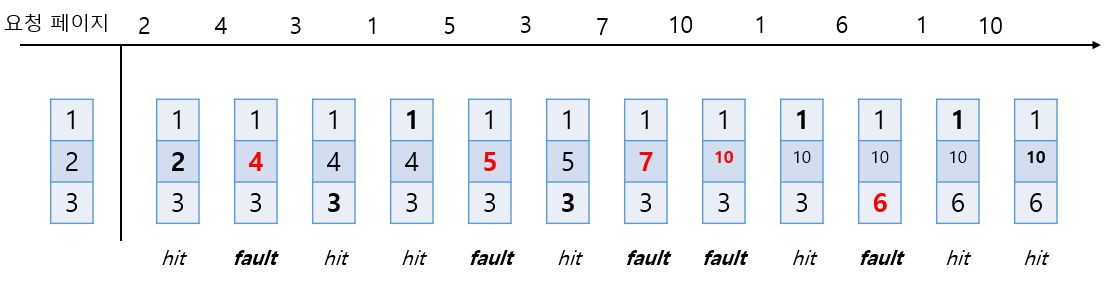 - 가장 최적의 페이지 즉, 미래에 사용될 가능성이 가장 낮은 페이지, 다른 말로 작업 집합에서 가장 멀어진 페이지를 희생 페이지로 선택한다.